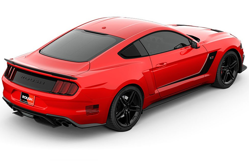 تتمتع السيارة بأربع فتحات عوادم وبالعلم الأميريكي على الجانبين الخلفيين وبكلمة Roush في الجزء الوسطي الأوسط المتواجد بين الضوئين. وتختلف السيارة هذه عن النسخة العادية بمشتت الهواء السفلي في الخلف الذي يعطي الموستانج مظهراً جذاباً.