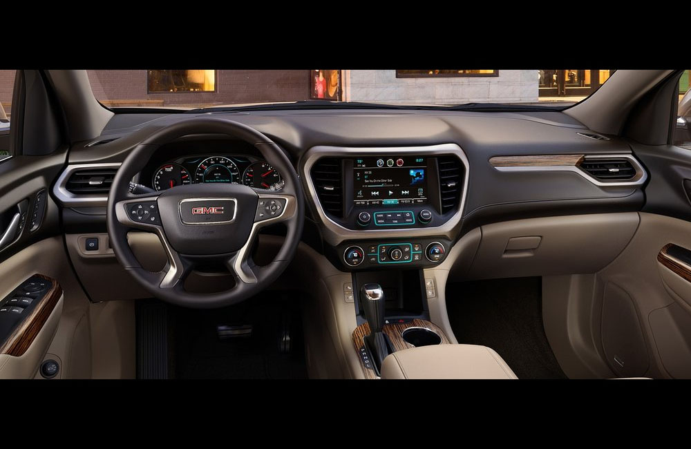 تقدم اكاديا 2019 ثلاثة صفوف من المقاعد تتسع لثمانية ركاب وتأتي مع قضبان سقف مصقولة من الألمنيوم ومصابيح أمامية بروجيكتور ومصابيح خلفية LED ومقبس خلفي ولوحة أدوات "منخفضة وذهبية" ، كما تتيح ميزة الصف الثاني Smart Slide إمكانية الوصول بسهولة إلى الصف الثالث.