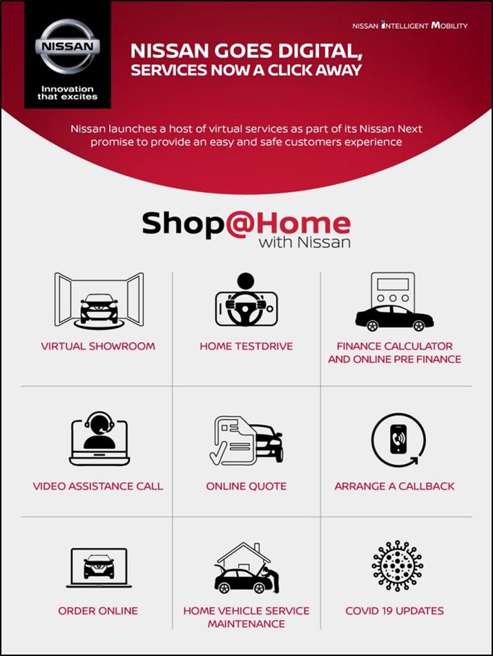 وأدرجت نيسان كافة الخدمات الرقمية عن بُعد ضمن تبويب Shop@Home الجديد على مواقعها الإلكترونية في دول مجلس التعاون الخليجي وجنوب أفريقيا ومصر وتركيا والهند. وتتضمن الخدمات مكالمة فيديو يمكن للعملاء من خلالها التحدث إلى ممثل عن الوكيل، أو طلب معاودة الاتصال بهم أو الدردشة عبر الإنترنت.