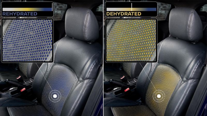 واللافت أن لون هذه المادة المغلّفة للمقعد والمقود يتغيّر، كلّما تعرّق السائق واحتكّ عرقه بها، فتميل إلى اللون الأصفر لإنذار السائق بضرورة احتساء كميّة من الماء، في حين يدلّ اللون الأزرق على طبيعيّة معدّل الماء في جسمه.
