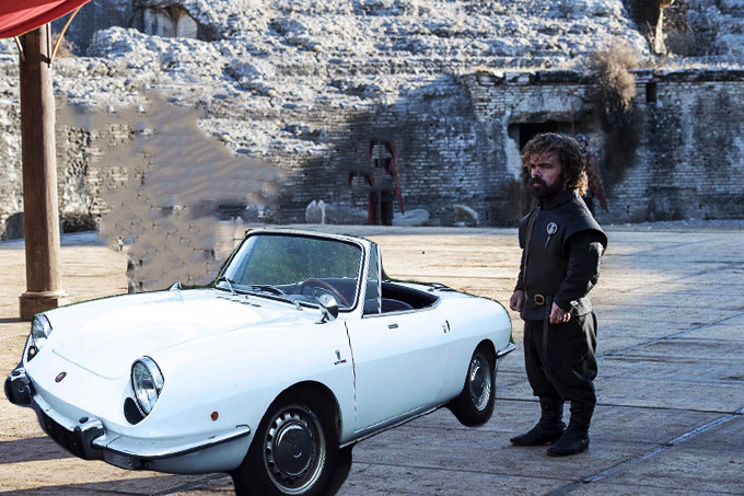 تيريون لانستر الرأس المدبر يقود سيارة فيات 850 سبايدر الكلاسيكية