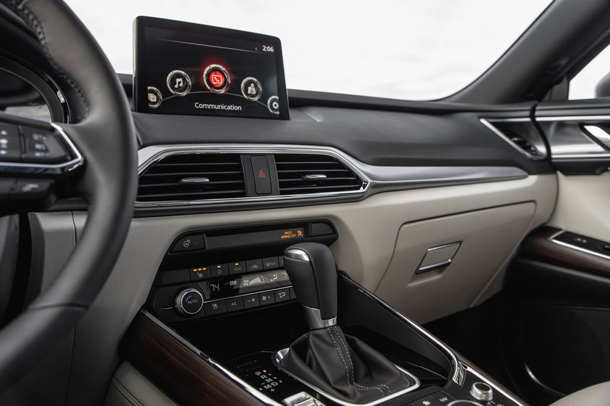 تبهر مقصورة cx9 بالمواد الراقية والتصميم التفصيلي، ولكن بالمقارنة مع سيارات الدفع الرباعي الأخرى في هذا القطاع، فهي تفتقر إلى مساحة الركاب والبضائع. افتح الباب والداخلية cx9 ترحب بالركاب بمقصورة راقية. قامت مازدا بترتيب البلاستيك الناعم الملمس بذوق رفيع مع حبيبات أنيقة وألومنيوم مصقول. يمكن طي الصفين الثاني والثالث من المقاعد في cx9 بسهولة لإجراء تغييرات سريعة في التكوين، وأرضية التحميل الناتجة مسطحة، مما يجعل من السهل تحميل العناصر الضخمة. مع انخفاض مقاعد الصف الثاني والثالث، تستوعب cx9 25 حالة من حقائب اليد.