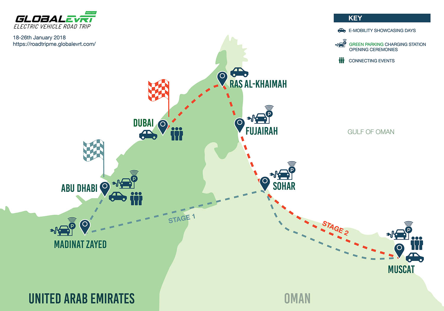 تنطلق قافلة السيارات الكهربائية من أبوظبي في تاريخ 18 يناير الجاري وستعبر صحراء العاصمة وتتابع طريقها إلى سواحل الإمارات الشمالية وصولاً إلى سلسلة جبال عمان، ومروراً بالعاصمة مسقط ومدينة صحار، ثم الاختتام في مدينة دبي المستدامة.