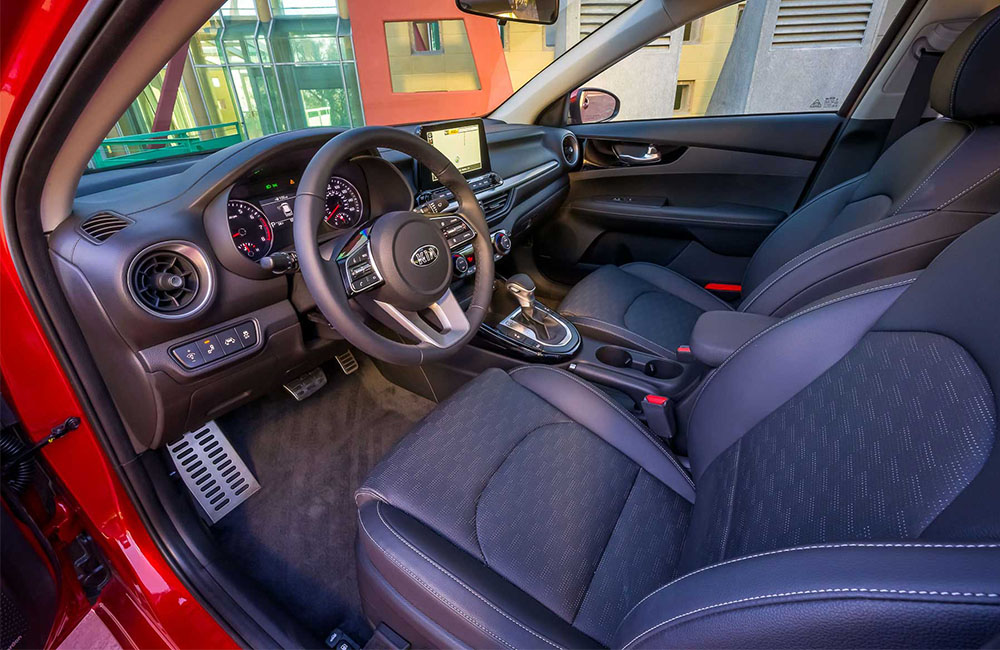 وبالانتقال إلى الداخل عليك أن تعرف بأن السيراتو حصلت على شاشة لنظام الترفيه والمعلومات قياس 8 إنش ونظامي أبل كار بلاي وأندرويد أوتو ومقود دائري الشكل مع أزرار تحكم ومقاعد مريحة ومساحة لا بأس بها ومنافذ يو أس بي.