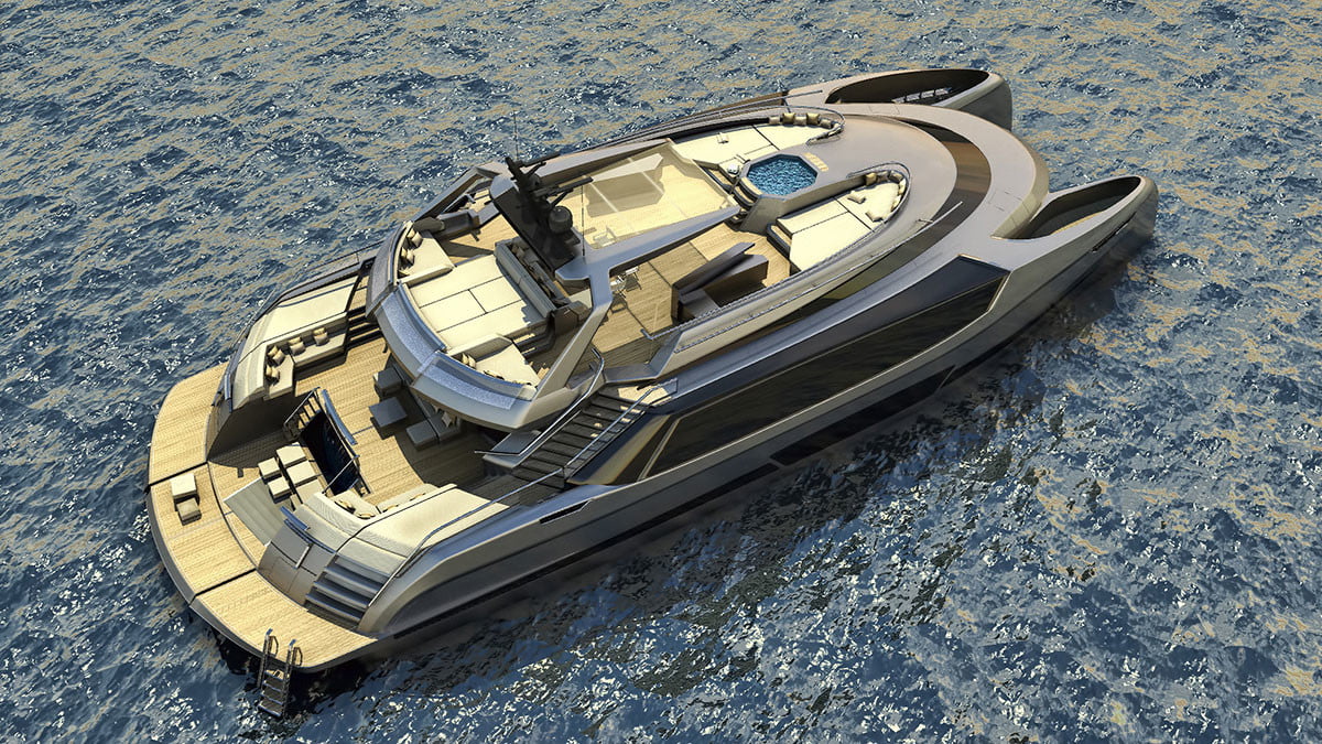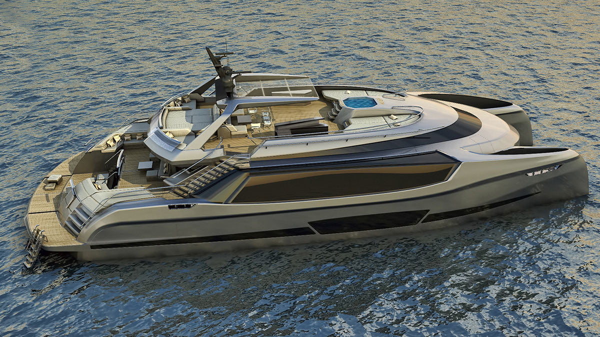 يشقّ اليخت مساره عبر قوسين منفصلين بطول 1.6 متر تمت صناعتهما عبر الألومنيوم والمواد المركّبة، ما يزيد الاستقرار في المياه مع سرعة قصوى 60 كم/س وخزان وقود يكفي قطع 3,000 كم بالرحلة الواحدة.