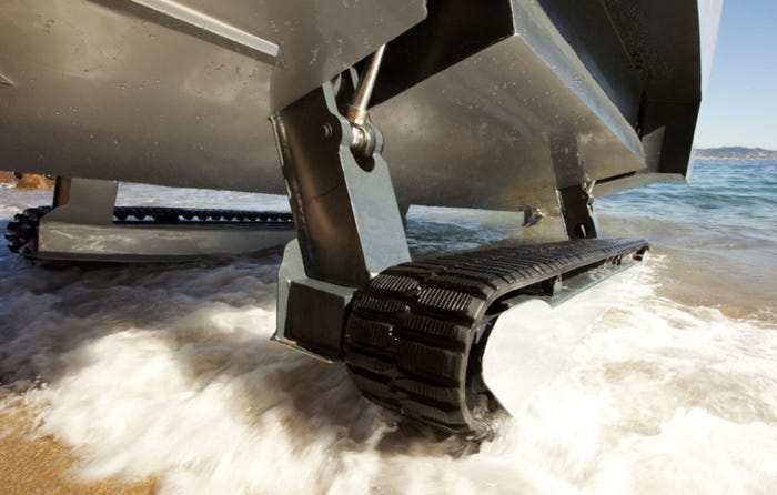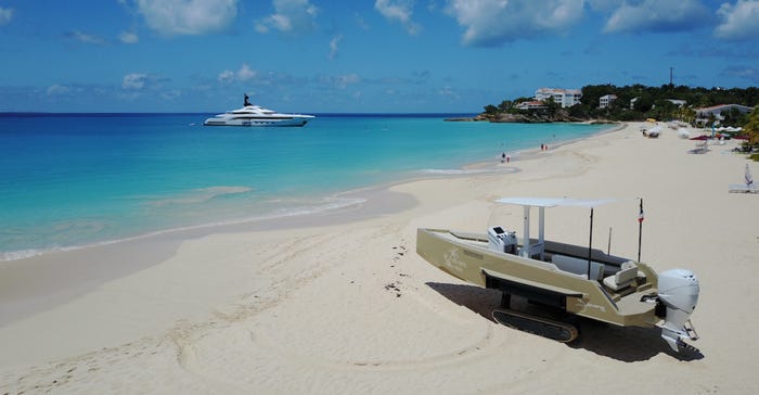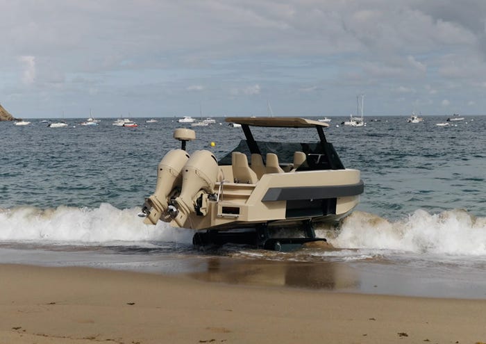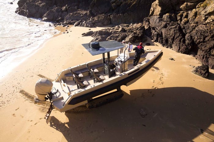 بفضل المسارات الشبيهة بالمستخدمة في الدبابات، والتي تمتلك الشركة براءة اختراعها، يُمكن لليخت الصعود إلى الشواطئ الرملية والسير على الطرق المعبدة.