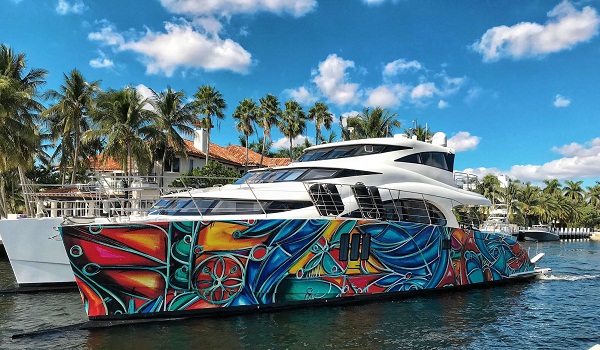نتيجة لذلك، أصبح اليخت يأتي مع تصميم ذو ألوان مختلفة متعددة مختلفة جذرياً عن اللون الأبيض الفارغ الأصلي للهيكل الخارجي، وهو ما يبدو بمثابة عمل فني يعبر عن طاقة وحركة وألوان مدينة ميامي الأمريكية الشاطئية وكل من يعيش بها.