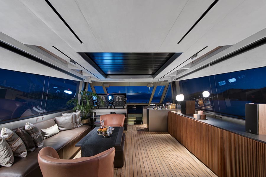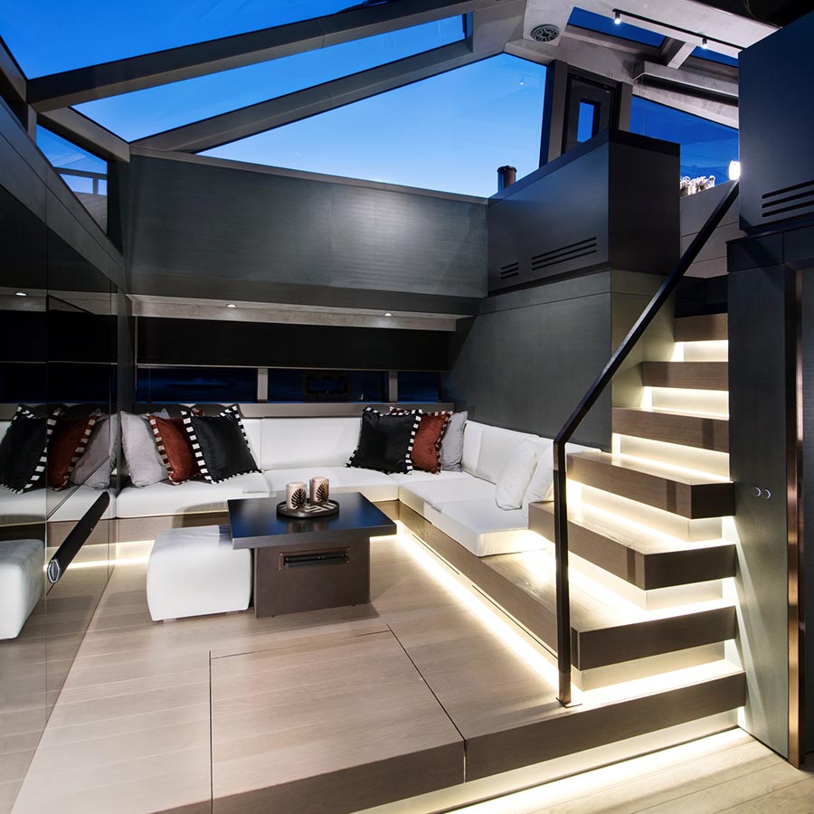 هذا وتشمل مميزات اليخت الأخرى مقدمة مفتوحة يمكن تحويلها لمنطقة حمام شمسي أو ساحة طعام فاخرة تكفي 12 شخص، أو حتى سينما في الهواء الطلق!